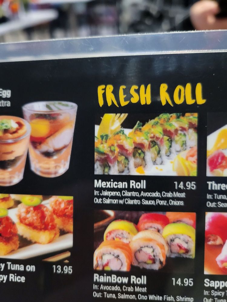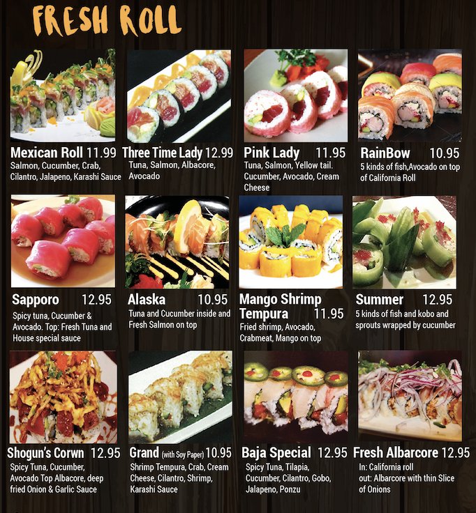 California roll, spicy tuna roll, shrimp tempura roll.