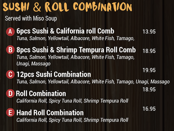 Includes four pieces of sushi, four pieces of sashimi, five pieces of crunch roll, spicy tuna hand roll.