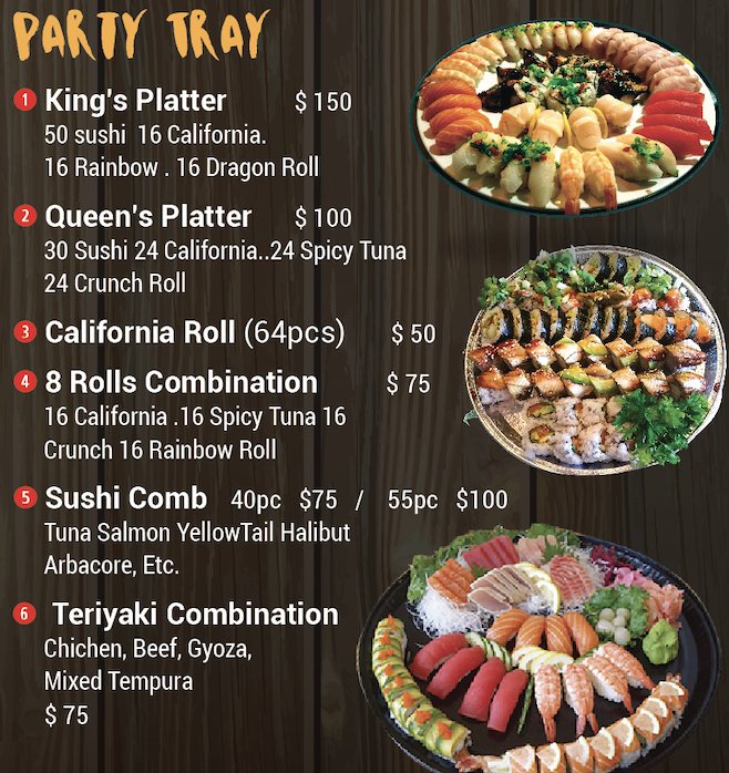 16 pieces. California roll, 16 pieces dragon roll 16 pieces. Shrimp tempura roll. 16 pieces rainbow roll